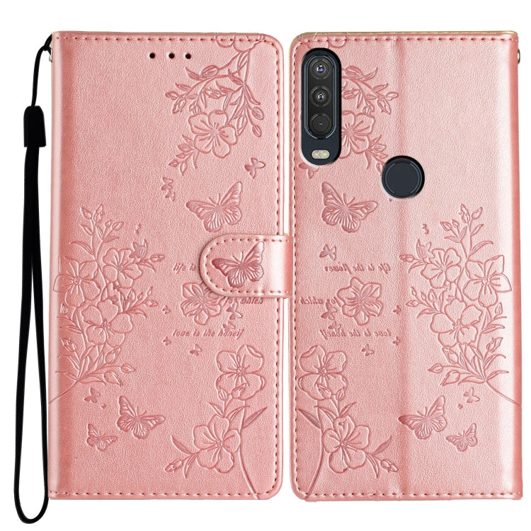 Funda de Cuero para Motorola One Action con Mariposas y Flores (Oro Rosa)