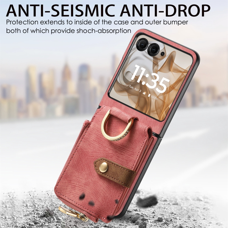 Estuche para Motorola Razr 50 con Billetera, Cremallera Vertical y Anillo Retro (Rosa)