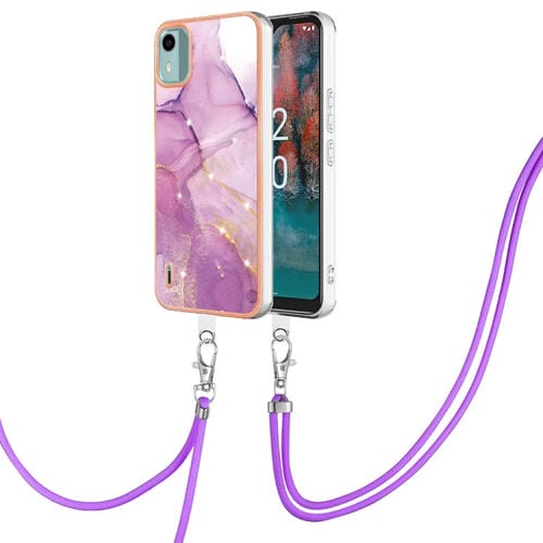 Estuche para Teléfono Nokia C12 IMD Doble Cara Mármol Galvanizado con Cordón (Púrpura)