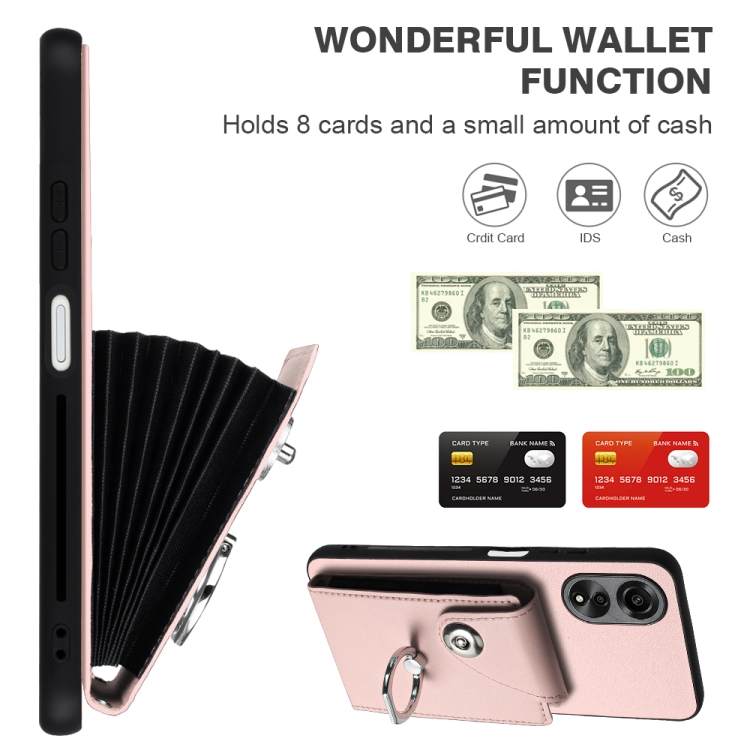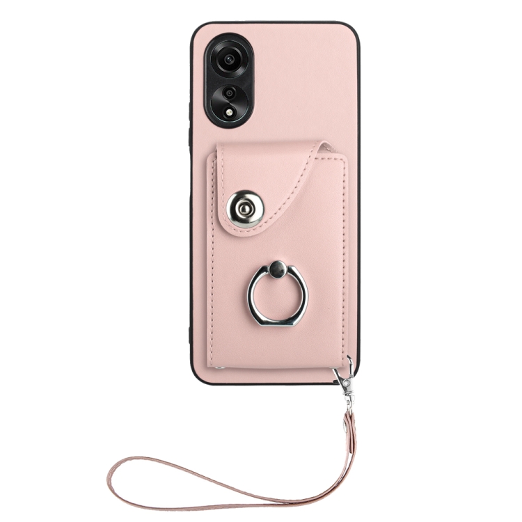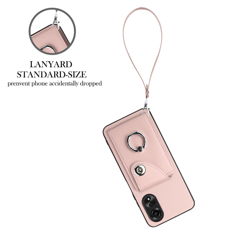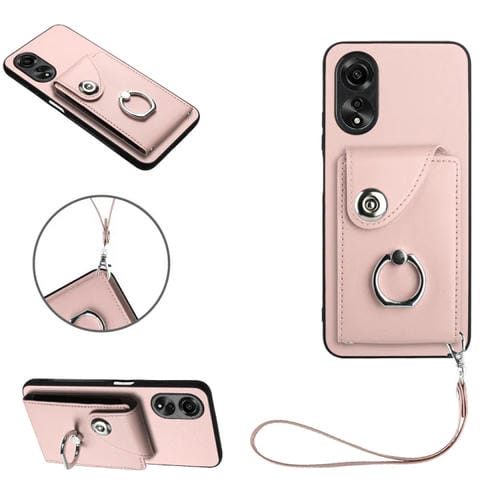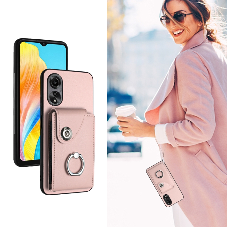 Para Oppo A38 4G / A18 4G Bolsa de Tarjeta de Órgano Global Soporte de Anillo Funda para Teléfono de Pu con Cordón (Rosa)