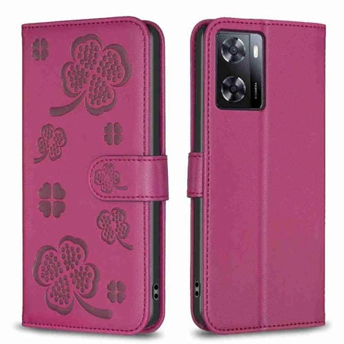Para Oppo A57 4G Funda para Teléfono de Cuero con Relieve de Cuatro Hojas (Rojo Rosa)