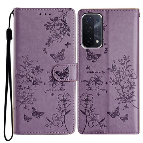 Para Oppo A74 5G / A54 5G Funda para Teléfono de Cuero con Relieve de Flor de Amor y Mariposa (Púrpura)