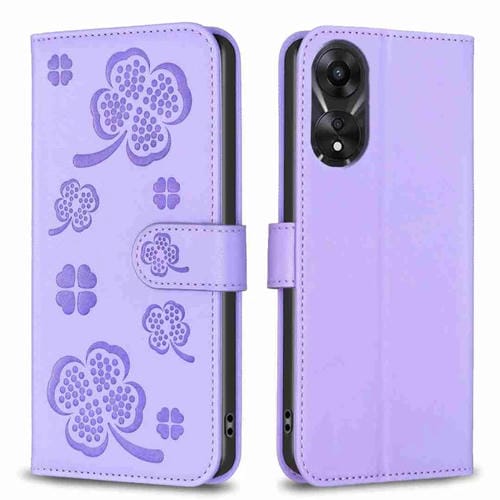 Para Oppo A78 5G Funda para Teléfono de Cuero con Relieve de Cuatro Hojas (Púrpura)