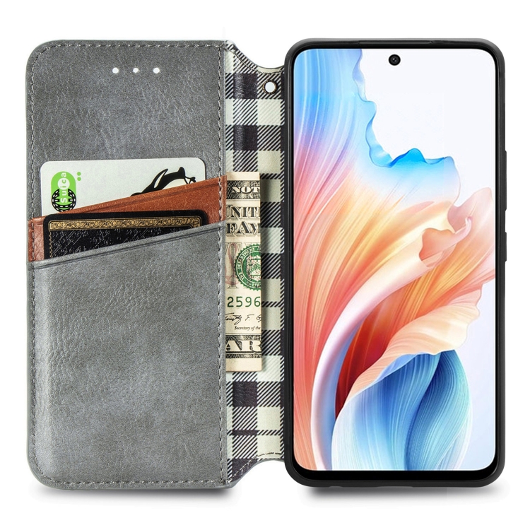 Para Oppo A79 5G / A2 5G Funda para Teléfono de Cuero Magnético Prensado con Rejilla Cúbica (Gris)