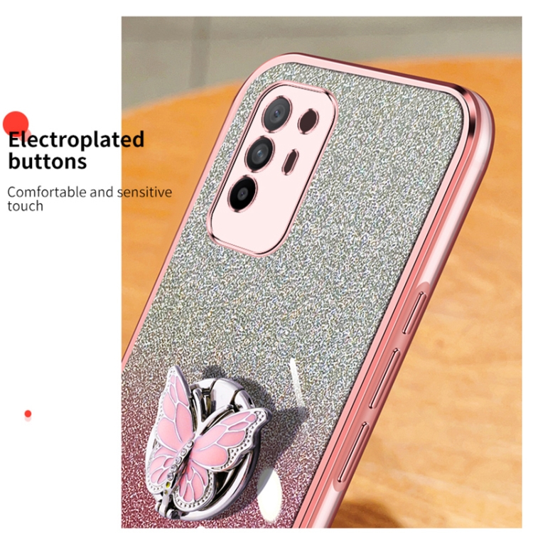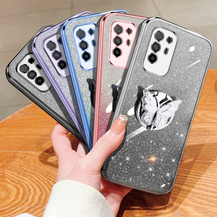 Para Oppo A94 5G Estuche para Teléfono de TPU con Soporte de Mariposa con Brillo Degradado Plateado (Negro)