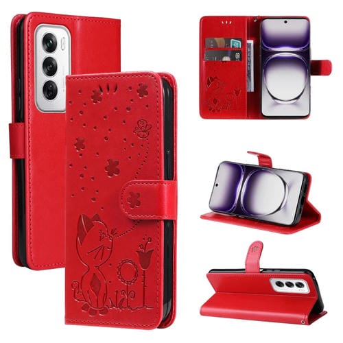 Para Oppo Reno12 5G Global Cat And Bee Funda de Cuero con Tapa En Relieve (Rojo)