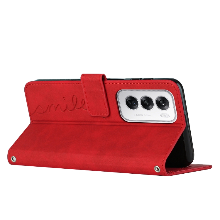 Para Oppo Reno12 5G Global Skin Feel Heart Funda para Teléfono de Cuero En Relieve con Cordón Largo (Rojo)