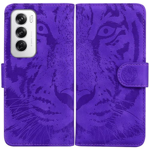 Para Oppo Reno12 5G Global Tiger Patrón En Relieve Funda de Cuero con Tapa para Teléfono (Púrpura)