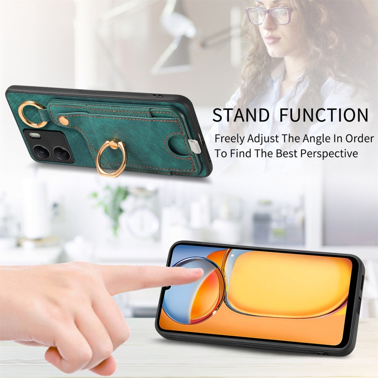 Para Redmi 9C Funda para Teléfono con Bolsa para Tarjeta con Anillo y Sensación de Piel Retro con Lazo para Colgar (Verde)