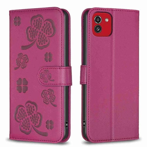 Funda de Cuero Samsung Galaxy A03 166mm con Relieve de Cuatro Hojas (Rojo Rosa)