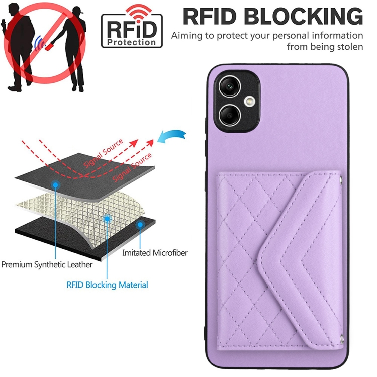 Funda para Teléfono Samsung Galaxy A05 4G con Bolsa para Tarjetas Rfid Textura Rómbica y Cordón Largo (Púrpura Claro)