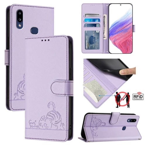 Estuche para Teléfono Samsung Galaxy A10S M01S Cuero Rfid Patrón En Relieve con Cordón (Púrpura)