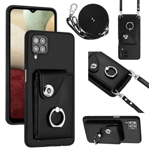Funda para Teléfono Samsung Galaxy A12 con Soporte para Anillo y Bolsa para Tarjeta con Cordón Largo (Negro)