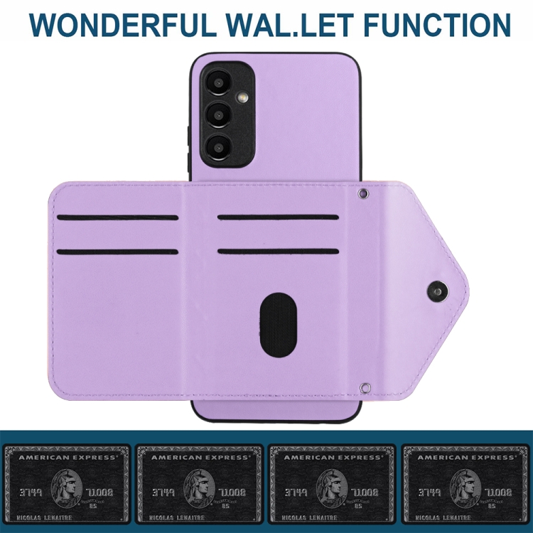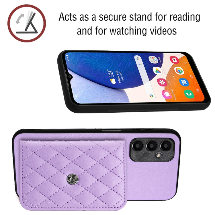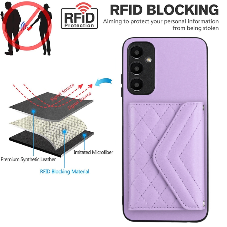 Funda para Teléfono Samsung Galaxy A14 5G Rfid con Bolsa para Tarjetas Textura Rómbica y Cordón Largo (Púrpura Claro)