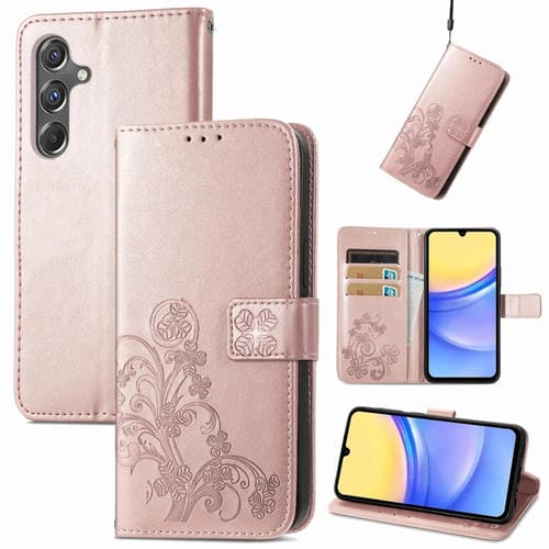 Funda para Teléfono Samsung Galaxy A15 Cuero Hebilla en Relieve Cierre de Cuatro Hojas (Oro Rosa)