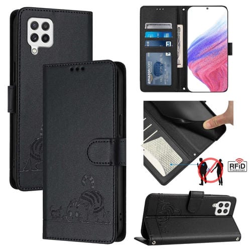 Estuche para Teléfono Samsung Galaxy A22 4G Cuero Rfid Patrón En Relieve con Cordón (Negro)
