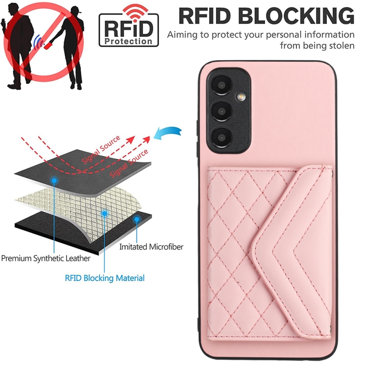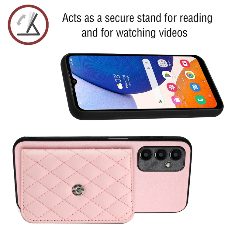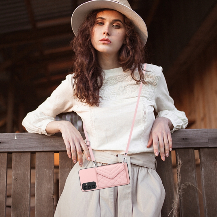 Funda para Teléfono Samsung Galaxy A24 4G con Bolsa para Tarjetas Rfid Textura Rómbica y Cordón Largo (Oro Rosa)