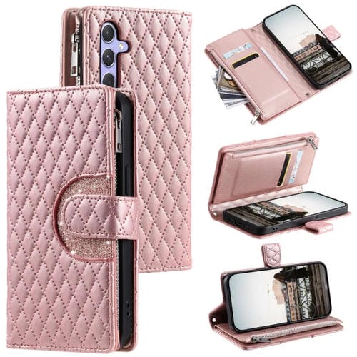 Estuche para Teléfono Samsung Galaxy A25 5G Cuero con Billetera, Cremallera y Celosía con Purpurina (Oro Rosa)