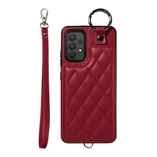 Estuche para Teléfono Samsung Galaxy A32 4G con Bolsa para Tarjetas Textura Rómbica y Cordón Corto (Rojo Vino)