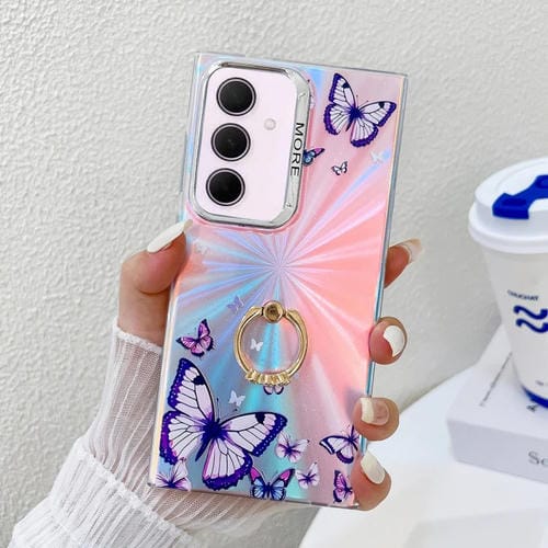 Estuche para teléfono Samsung Galaxy A35 5G con soporte anillo mariposa láser galvanoplastia (Morado)
