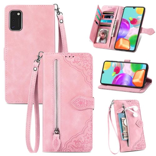Funda de Cuero para Samsung Galaxy A41 con Cremallera y Flores en Relieve (Rosa)