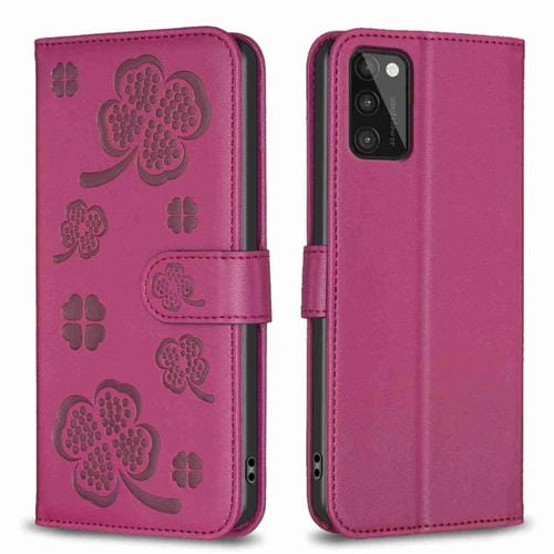 Funda de Cuero Samsung Galaxy A41 Relieve Cuatro Hojas (Rojo Rosa)