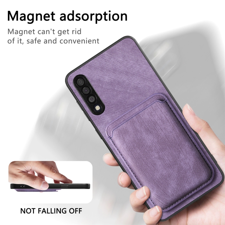 Funda de teléfono Samsung Galaxy A50S magnética con bolso de tarjeta de cuero retro (Púrpura)