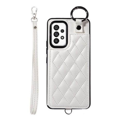 Estuche para Teléfono Samsung Galaxy A53 5G con Bolsa para Tarjetas Textura Rómbica y Cordón Corto (Blanco)