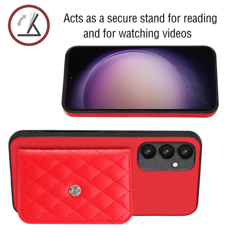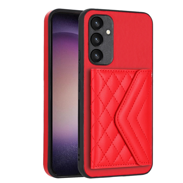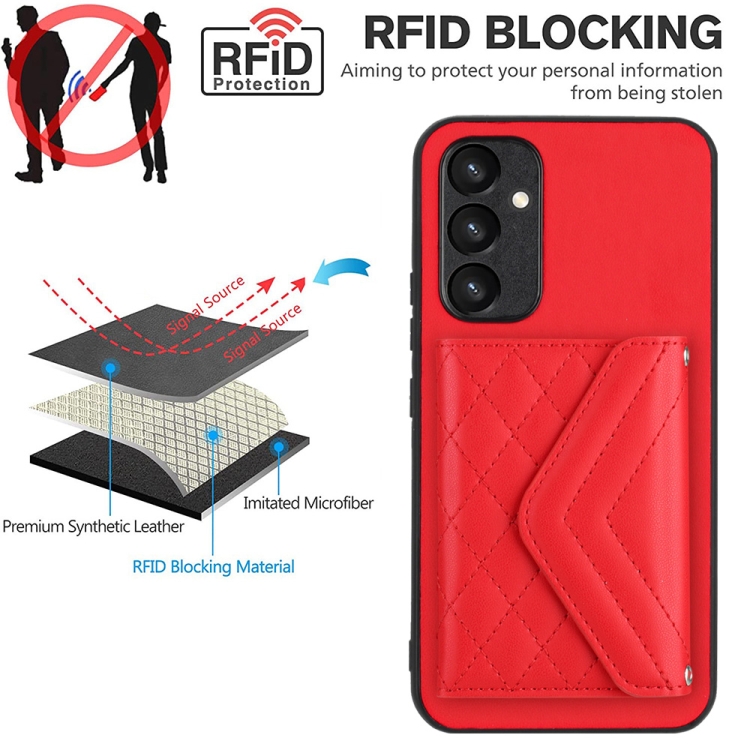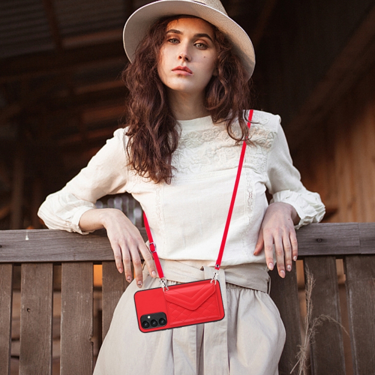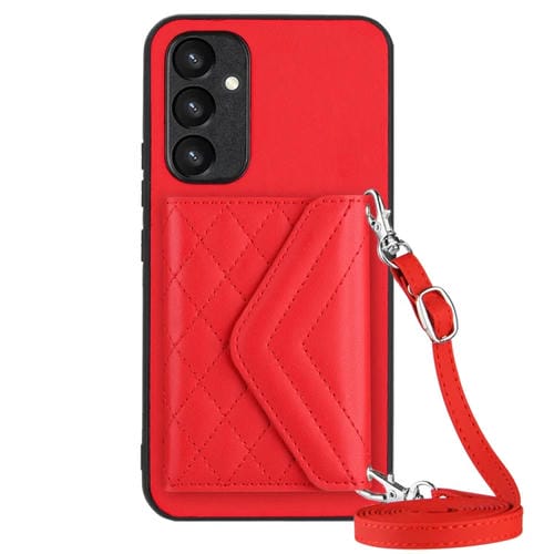 Funda para Teléfono Samsung Galaxy A54 5G con Bolsa para Tarjetas Rfid Textura Rómbica Cordón Largo (Rojo)