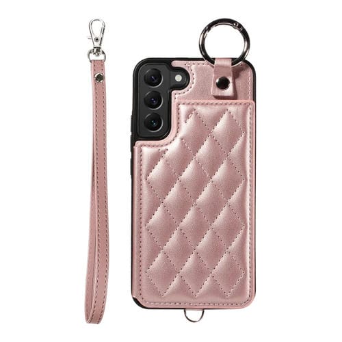 Estuche para teléfono Samsung Galaxy S22+ 5G con bolsa para tarjetas textura rómbica y cordón corto (Oro Rosa)