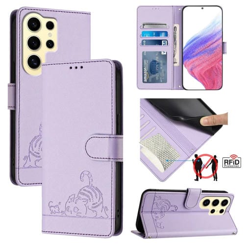 Estuche para Teléfono Samsung Galaxy S24 Ultra 5G Cat Rat con Patrón En Relieve Rfid Pu con Correa para la Muñeca (Púrpura)