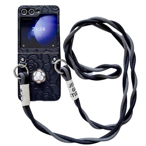 Funda Protectora Samsung Galaxy Z Flip3 5G Impression Camellia Pattern con Cordón Largo (Negro)