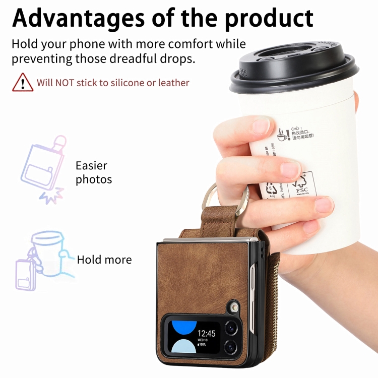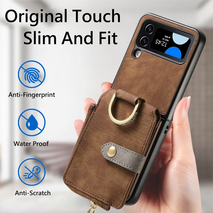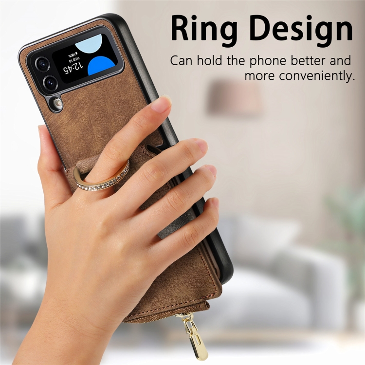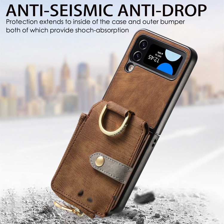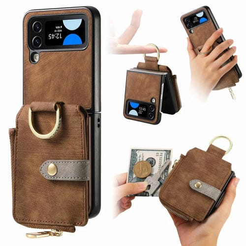 Funda para Teléfono Samsung Galaxy Z Flip4 con Billetera, Cremallera y Anillo con Sensación de Piel Retro (Marrón)
