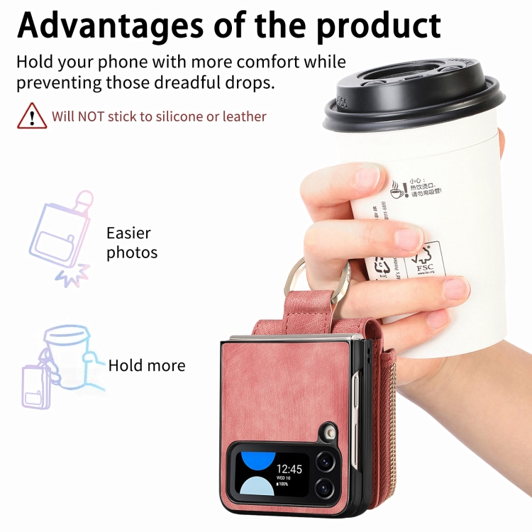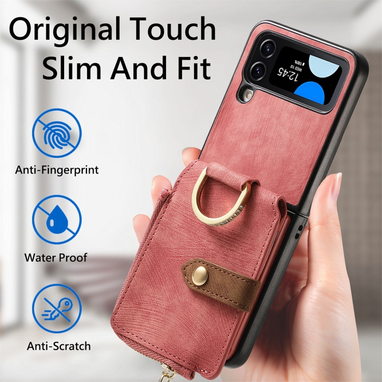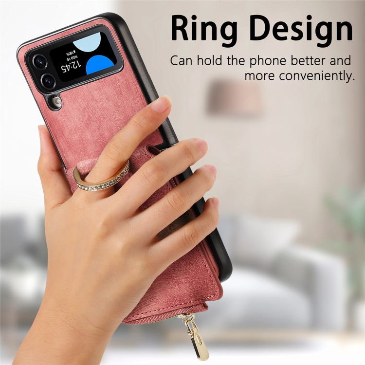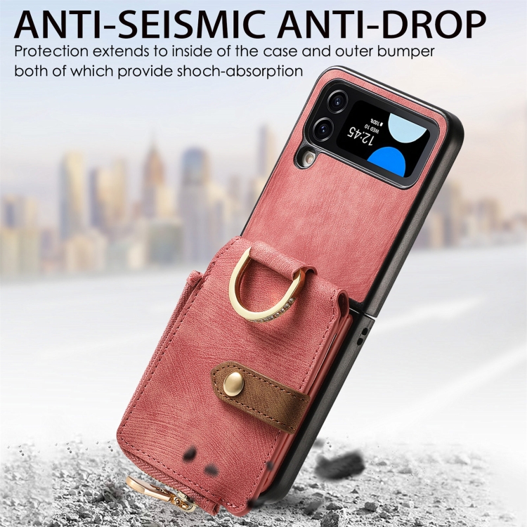Funda para teléfono Samsung Galaxy Z Flip4 con billetera, cremallera y anillo, sensación de piel retro (Rosa)