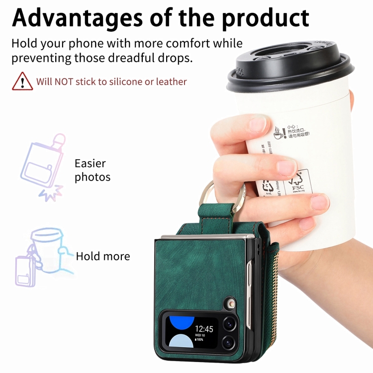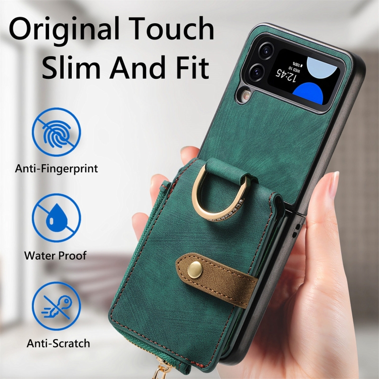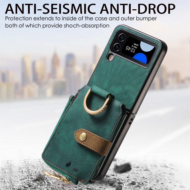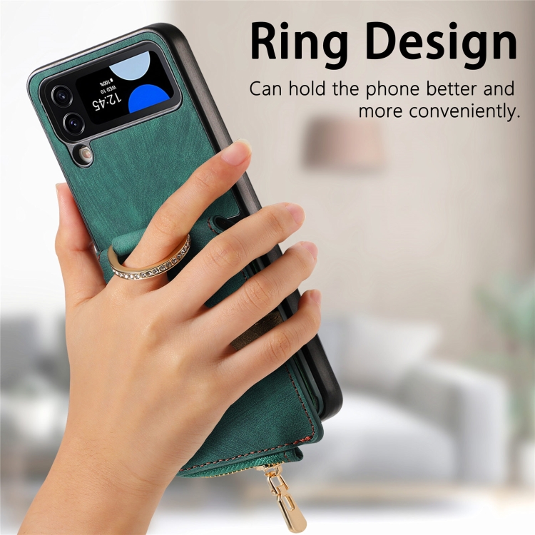 Funda para Teléfono Samsung Galaxy Z Flip4 con Billetera, Cremallera y Anillo con Sensación de Piel Retro (Verde)
