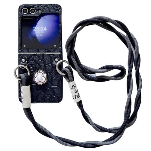 Funda Protectora Samsung Galaxy Z Flip5 5G Impression Camellia Pattern con Cordón Largo (Negro)