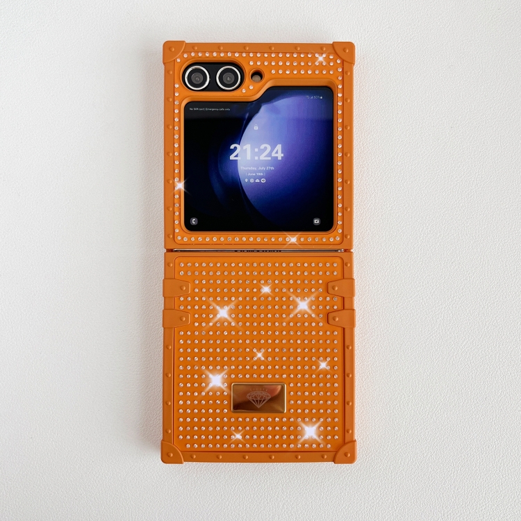 Estuche para Teléfono Samsung Galaxy Z Flip5 5G PC a Prueba de Golpes con Diamantes Completos y Logotipo (Naranja)