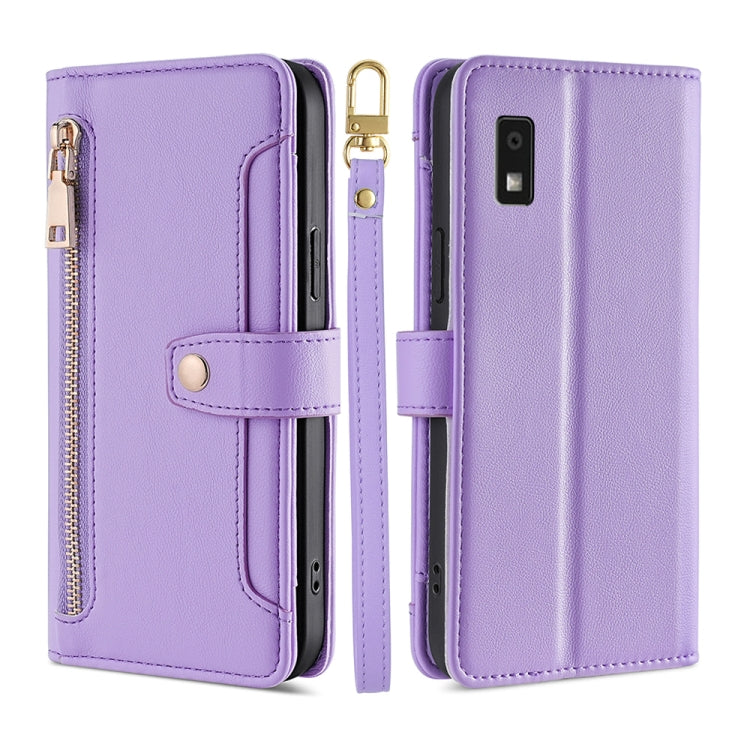 Funda de Cuero Crossbody para Sharp Aquos Wish 3 Lite con Textura Sheep y Zipper (Púrpura)