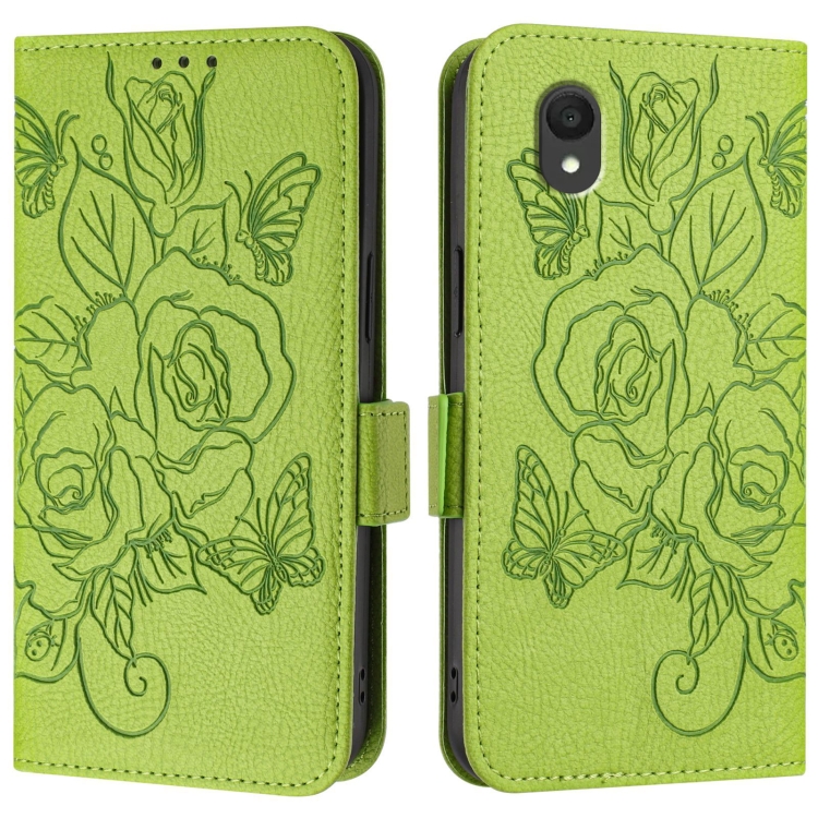 Funda de Cuero Antirrobo RFID para TCL 201 con Rosa en Relieve (Verde)
