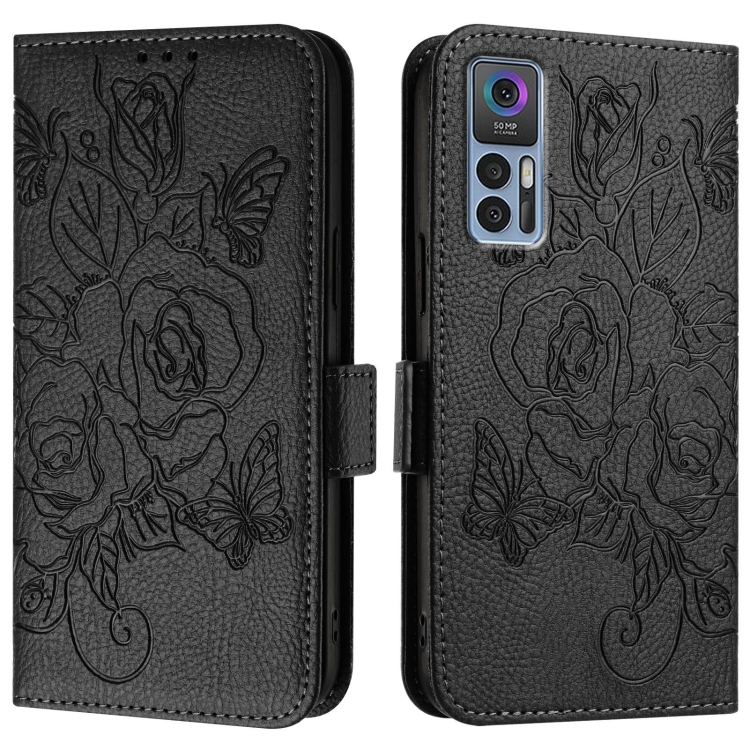 Funda de Cuero Antirrobo RFID para TCL 30 5G / 4G / 30+ con Rosa en Relieve (Negro)