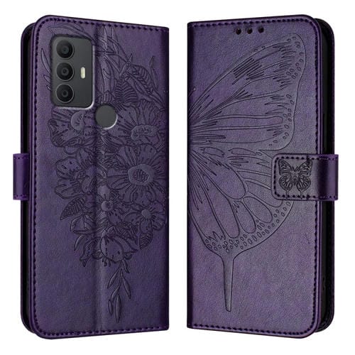 Funda de Cuero para TCL 306 con Mariposa en Relieve (Púrpura Oscuro)