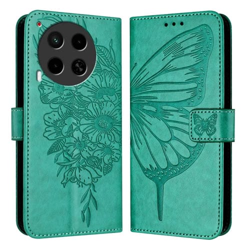 Funda de Cuero para Tecno Camon 30 4G / 5G con Mariposa en Relieve (Verde)
