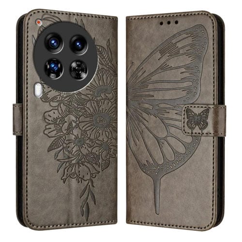 Funda de Cuero para Tecno Camon 30 Premier 5G con Mariposa en Relieve (Gris)