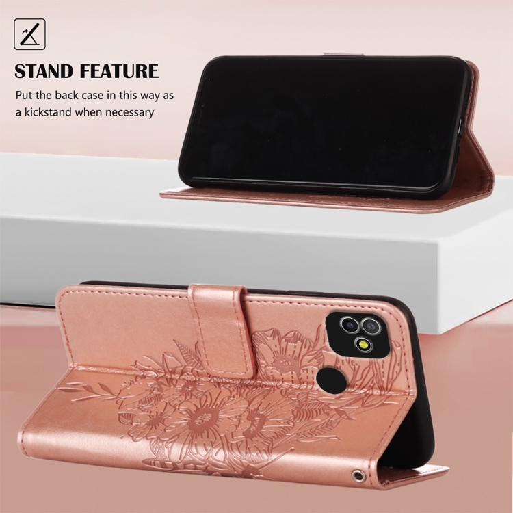 Caja Telefónica de Cuero para Tecno Pop 5 con Mariposa en Relieve (Oro Rosa)