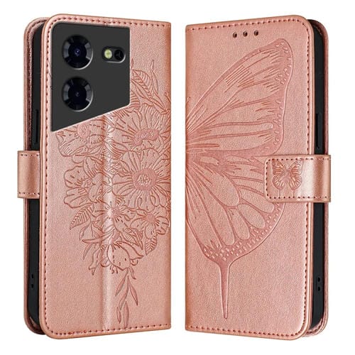 Funda de Cuero para Tecno Pova 5 Pro 5G con Mariposa en Relieve (Oro Rosa)