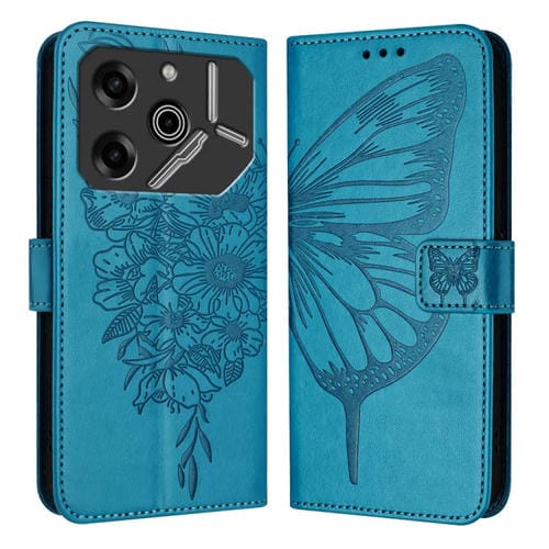 Funda de Cuero para Tecno Pova 6 5G con Mariposa en Relieve (Azul)