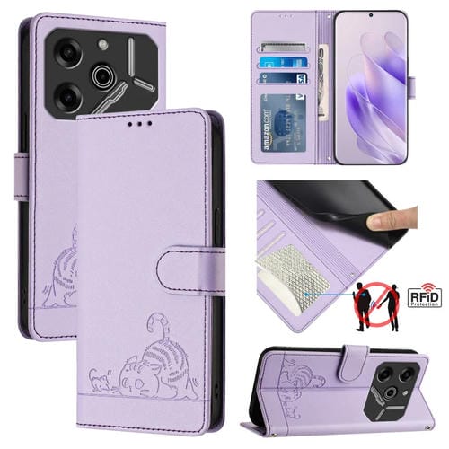 Funda para Tecno Pova 6 Pro Li9 Cat Rat de Cuero RFID con Patrón en Relieve y Cordón (Púrpura)