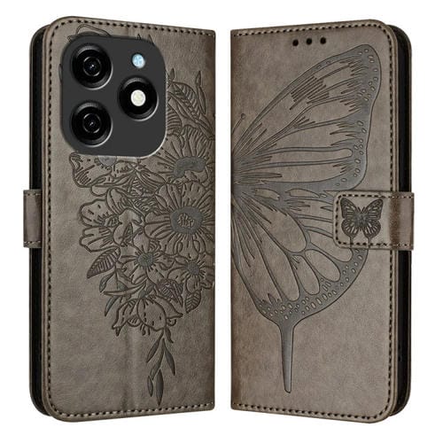 Funda de Cuero para Tecno Spark 20 con Mariposa en Relieve (Gris)