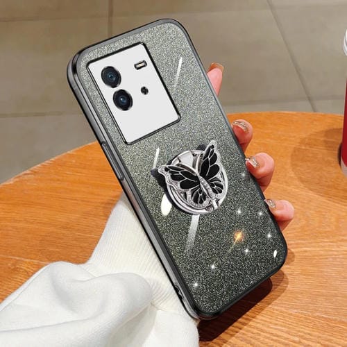Para Vivo Iqoo Neo6 Funda para Teléfono de TPU con Soporte de Mariposa con Brillo Degradado Plateado (Negro)