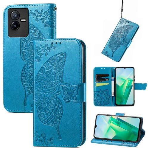 Para Vivo T2X 5G Butterfly Love Flower Estuche para Teléfono de Cuero En Relieve (Azul)
